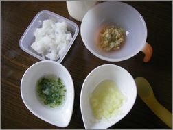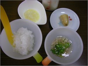 ひき割り納豆に熱湯を回し掛けたものと、大人メニューのキャベツの味噌汁からキャベツをとりわけ、ひたすらやわらかく茹でたものをみじん切りにして、一緒に和えただけの簡単メニュー。