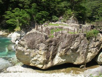 宿のすぐそばの川の大きい岩の上で記念撮影。
