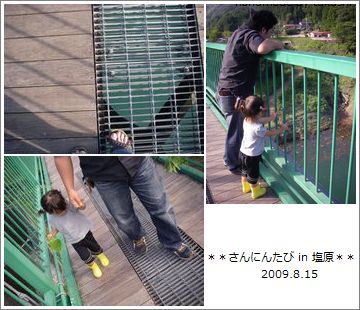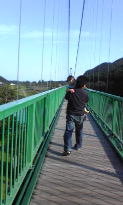 このつり橋、途中から下が透けて見えるようになっていて、もんのすんごく怖いのです!